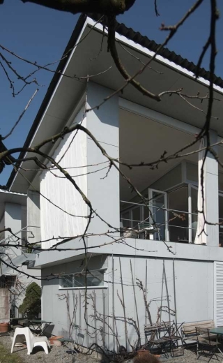 Durch die Gasse zwischen den beiden Hausteilen und den gegen Süden sich öffnenden Pultdächern entstehen spannende Ausssenräume, erlebnisreiche Hauszugänge und eine befriedigende Besonnung auch des nördlichen Hausteils. Der mehrheitlich im Hang liegende Sockel enthält die Kellerräume und Garagen, darüber liegen pavillonartig die beiden Hausteile, die als Holzleichtbauten ausgeführt wurden. In den Erdgeschossen sind die Schlafzimmer angeordnet, die grosszügigen Wohnräume mit Terrassen liegen oben und werden durch eine Küchenskulptur in einen Wohn- und einen Essbereich gegliedert.