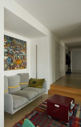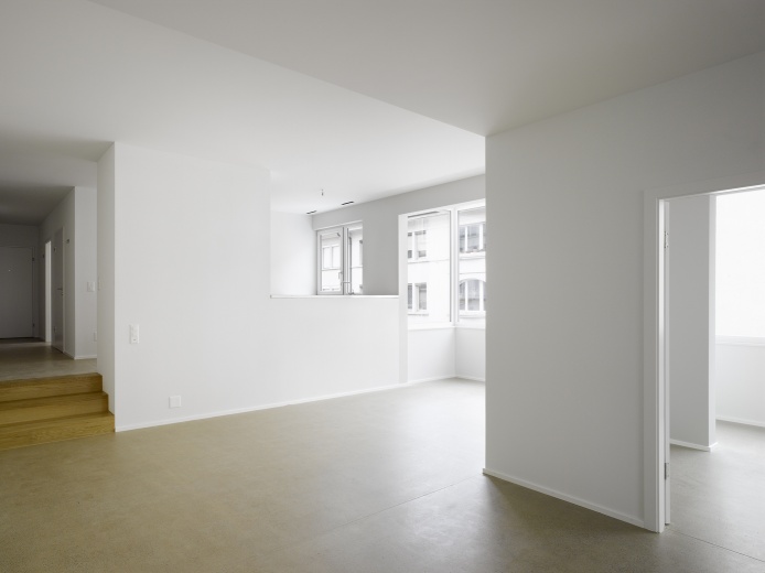 Sowohl im Innern wie auch aussen ist der Holzbau verkleidet (Schall-/Brandschutz). Die Grundstruktur bleibt aber erlebbar und trägt neben den Höhenversprüngen zur räumlichen Vielfalt der Wohnungen bei.