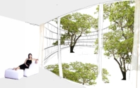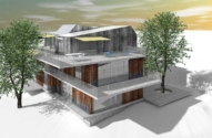 Auf den je drei Wohngeschossen können unterschiedliche Bezüge zum Aussenraum angeboten werden: Im Erdgeschoss zum Garten, im Obergeschoss in den Baumkronen und in den Attikageschossen als kleine Häuschen unter dem Himmel.